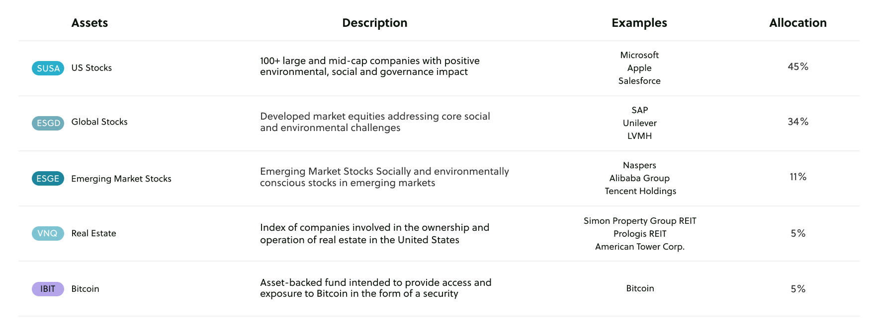 ستجد أدناه قائمة صناديق المؤشرات المتداولة في المحفظة المسؤولة اجتماعيًا للكريبتو لدينا: