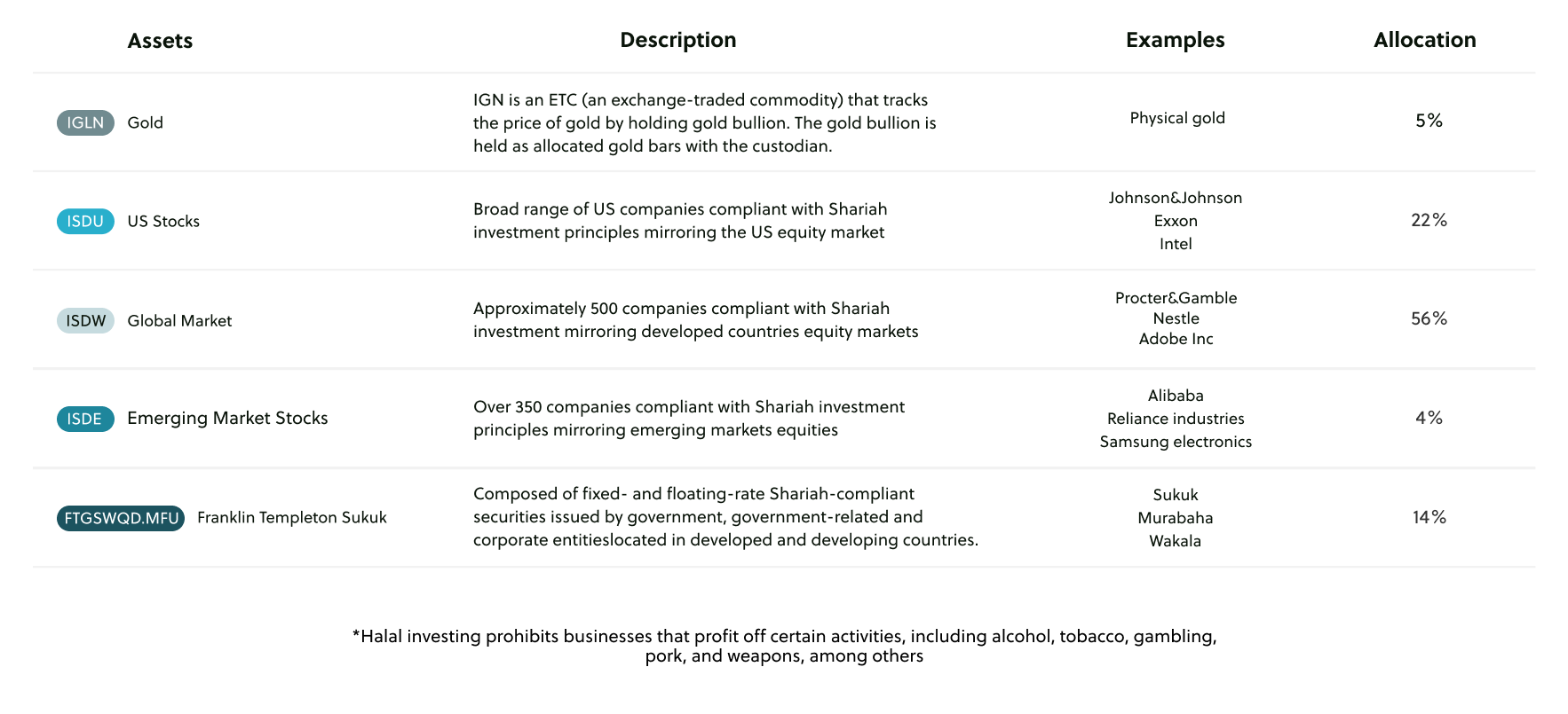 ستجد أدناه قائمة صناديق المؤشرات المتداولة في المحفظة الحلال لدينا: