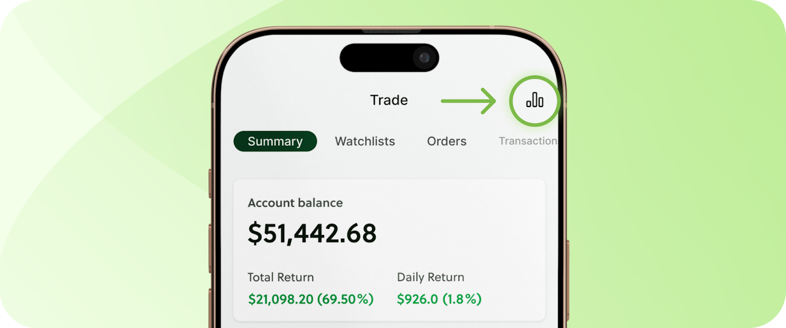 You can access your trade account's historical performance by going to the “Trade” tab on your Sarwa app, and clicking the top-right icon. Under the there you will be able to see the historical performance of your Sarwa trade account in three graphs: