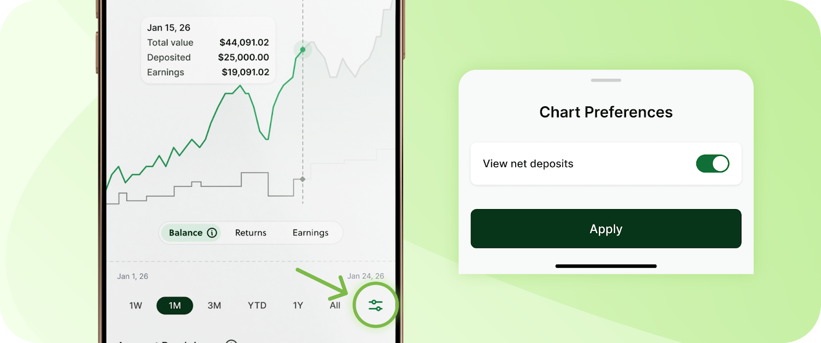 Earnings: When scrubbing on the graph you can also view your earnings at any historical point in time. Earnings is the total amount you’ve earned through investing and represents the difference between your Account Balance and your net deposits.